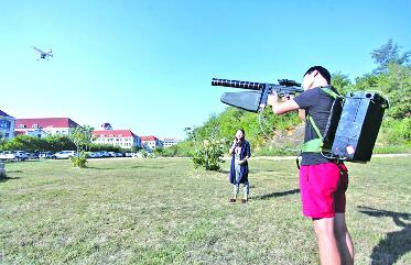 利用电磁干扰系统使正在空中飞行的小型无人机失控悬停,再出动无人机捕获器实施空中打网抓捕……昨日下午,在中国海洋大学崂山校区一处草...