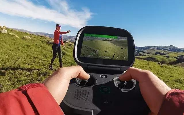 此外控制器还配备一块触摸屏,让你不需要额外的手机或平板进行操作。这款屏幕在户外强光条件下,会自行调整亮度,方便观看,并第一视角实时显示无人机航拍影像。