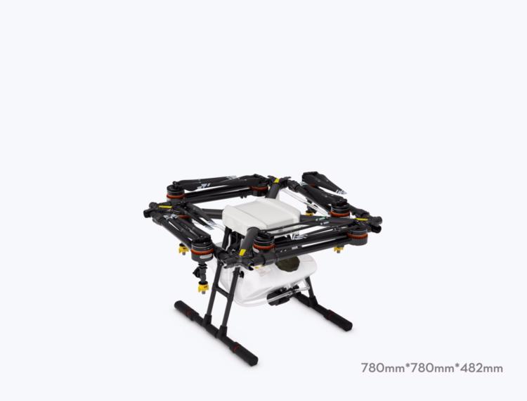 长相也跟普通的拍摄用的大疆无人机很不一样。它配有 4 个喷嘴,能够携带 10kg 的重物,这里主要就是放有药剂的药箱。相比大疆的精灵系列产品而言,MG-1 的体型很大,将机械臂折叠后,也有 780mmX780mmX482mm 的大小。