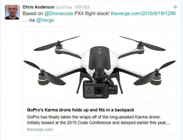 刚刚发布的GoPro Karma无人机使用的就是基于PX4开发的