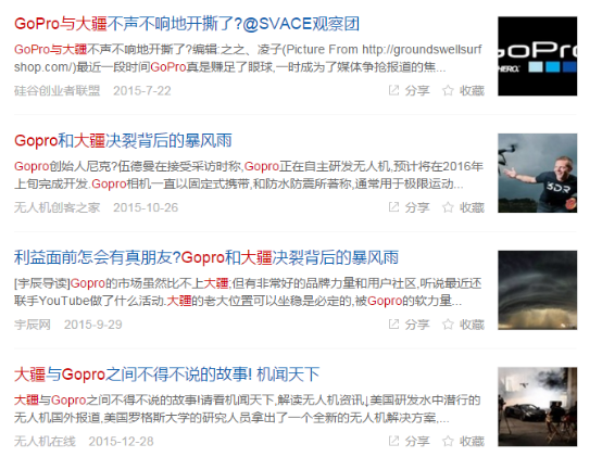 从用户覆盖的角度看,尽管GoPro 与大疆的用户有所重叠,但前者的用户群以极限运动发烧友为主,后者主要集中在摄影爱好者,旅游爱好者;前者用来记录运动行为,后者用来分享风景。大疆无人机目前致力于“媒体直播”平台的建构,并不断地丰富直播的内容矩阵。随着消费市场朝着精准化,垂直化的方向发展,这一场细分市场的战争正暗潮涌动。