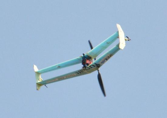 该电动无人机外形酷似一个小型双翼飞机。起飞时,它依靠旋翼旋转垂直上升,就像一架直升机。当达到预定高度时,机身发生 90 翻转,旋翼产生朝前推力,无人机像一架飞机一样向前飞行。