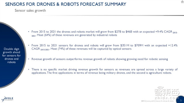 从本质上讲,无人机作为飞行器,可以视作机器人品类的一部分。今天的智能内参想要推荐来自YOLE的报告,则重点从机器人/无人机细分市场、应用方向、产品结构、传感器特性等方面对未来五年的总体市场做出预测,相信阅读本文后,你一定能从中得到启发,从而摸索出新的增长点。