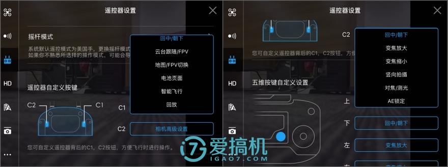 设置页面有非常详尽的飞控参数、遥控按键与灵敏度、智能功能、图传等调节项目。在Mavic Pro上的智能功能里“兴趣点环绕(围绕某个地点)、航点飞行(地图上手动指路)、热点跟随(跟人跑)、返航锁定、航向锁定(无视机头方向操作)”是相对比较普通的老功能,这里就不多赘述了。