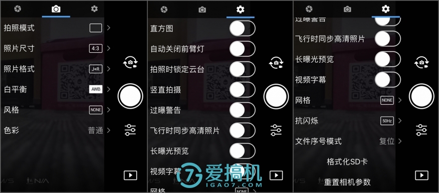 对焦和大光圈:运动相机和无人机共有特征就是大广角、短焦距的定焦镜头,这样没有对焦的烦恼,但也没有远近景虚化的可能了。这次Mavic Pro用了自动对焦镜头,而且光圈也提升到了f2.2,最近对焦距离0.5米,支持手动对焦点选择,有曝光和对焦锁定功能,功能和设定上和手机非常接近。