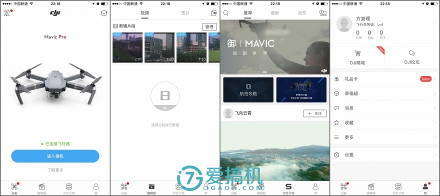 大疆的消费级无人机通用一个app,但不同型号在功能上会有一定出入。基础布局都是顶栏飞行参数、右侧相机参数、左侧智能功能(一键起降、智能跟随等)。