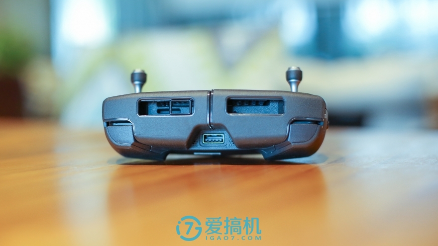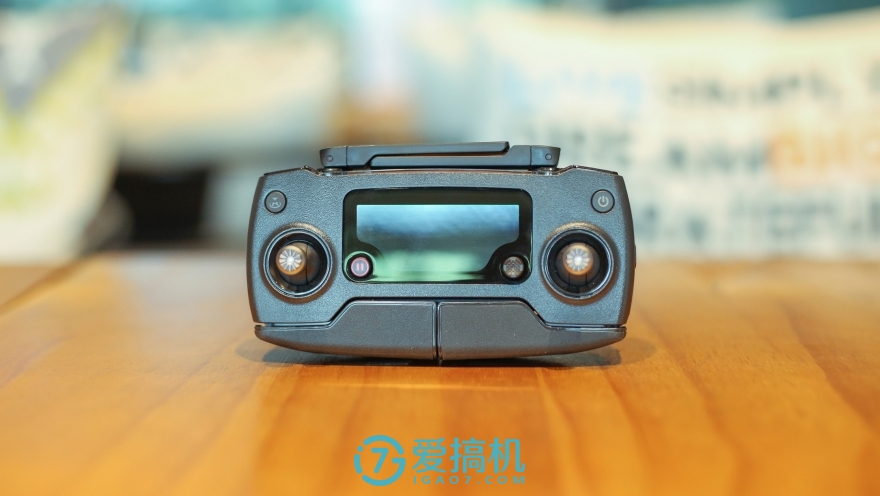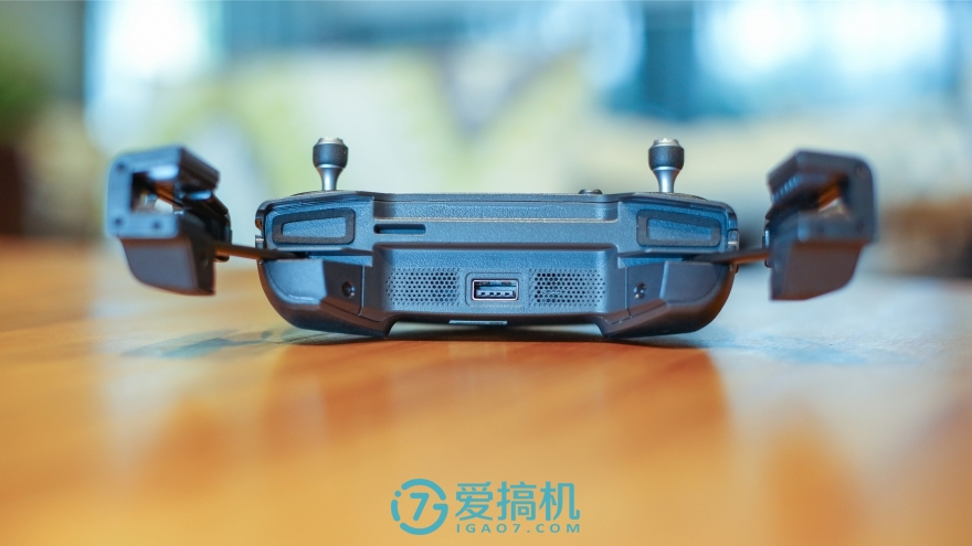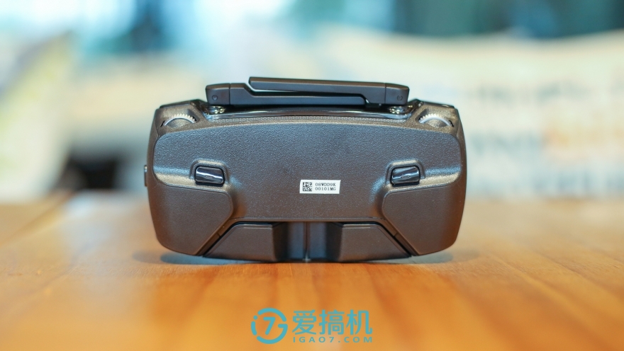 Mavic Pro的遥控只比iPhone7 大一些,很有掌上游戏机的味道,分量比预想中要大一点。其外观设计为折叠便携进行了很多优化,例如非对称设计的折叠天线,向内折叠的手机支架。油门和方向摇杆的大小和齿牙都有相应的缩小,摇杆两边的一键起降、电源按钮、屏幕两端的功能暂停按钮和小的方向摇杆都变得相当小。左右肩是录像和快门按钮,它们下方是控制云台的拨轮。