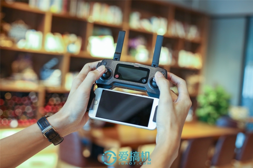 遥控通过数据线将新的OcuSync 图传数据传输到手机屏幕上,后者的传输距离从前代Lightbridge图传的5公里720p升级到 7公里1080P,这套地球上民用最强的远距离图像传输系统,大幅抛离了同行甚至大疆自己的前旗舰产品。而这部分连接线的设计也很有趣,支架上有固定扣数据线的移动卡扣,接上手机之后通过两侧的软胶垫固定,最大能夹入iPhone 7 Plus接近的手机。