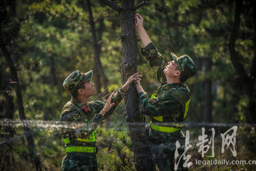 图为边防官兵正在老铁山自然保护区内拆除捕鸟网具