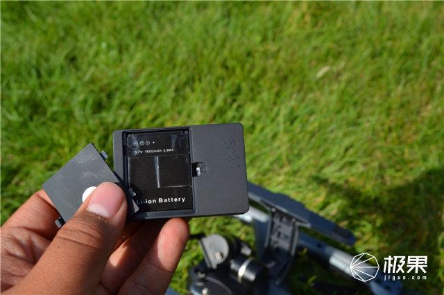 相机的背面是电池仓。飞豹无人机为其配备了一颗容量为1600mAh的电池,相机是通过usb接口与云台连接,由无人机直接供电并充电。