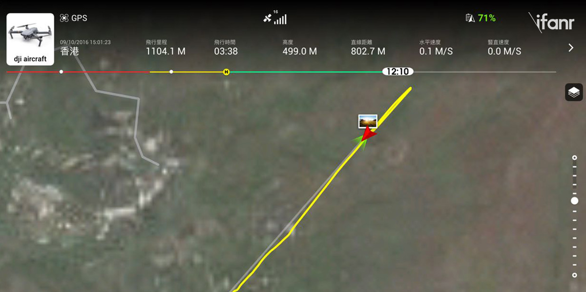 可是,Odin 亦三度把 Mavic Pro 飞到 500 米的高空(危险动作,请勿模仿),而其中一次还是在台风刚过(平均风速高达每小时 20 公里)之时,在一个约有 70 米高的无人山头,在 400-500 米的高度上持续飞了接近 1 公里。尽管大疆的无人机应用程式 DJI Go 几度发出风速警告,但我们仍然没明显感觉到 Mavic Pro 的飞行规迹有任何异常。