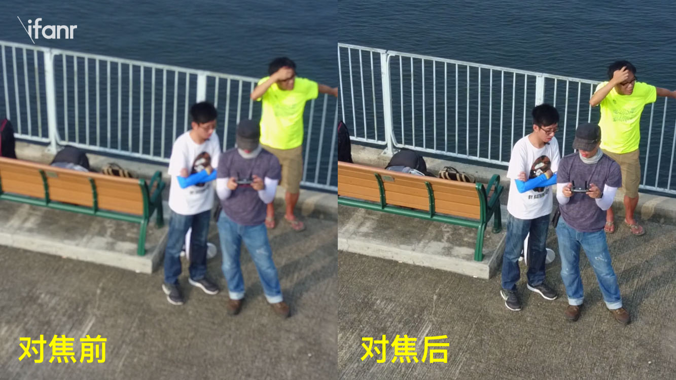 后来,大家才留意到原来 Mavic Pro 由以往消费级无人机常用的泛焦镜头(无限远焦距),改为自动对焦镜头。不过,用户必须要先在应用上先点一下,然后相机才会开始自动对焦,否则相机就对不了焦,画面就会完全糊掉(上图)。