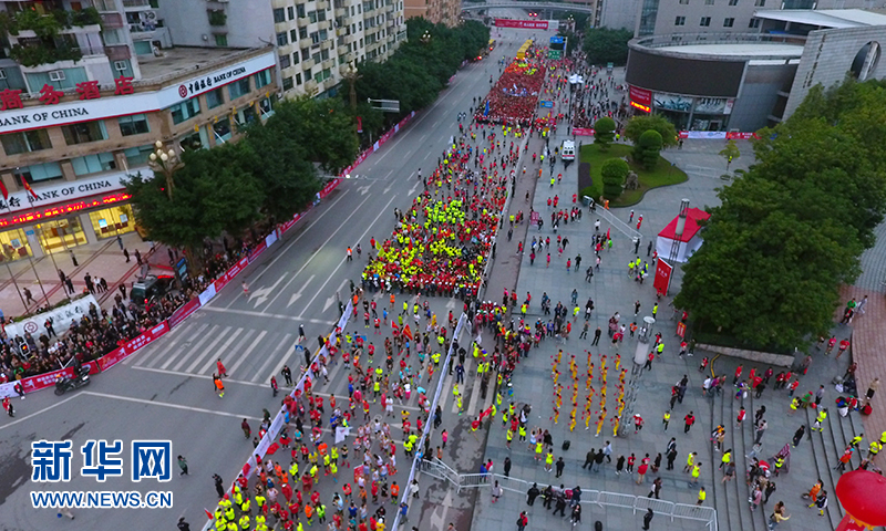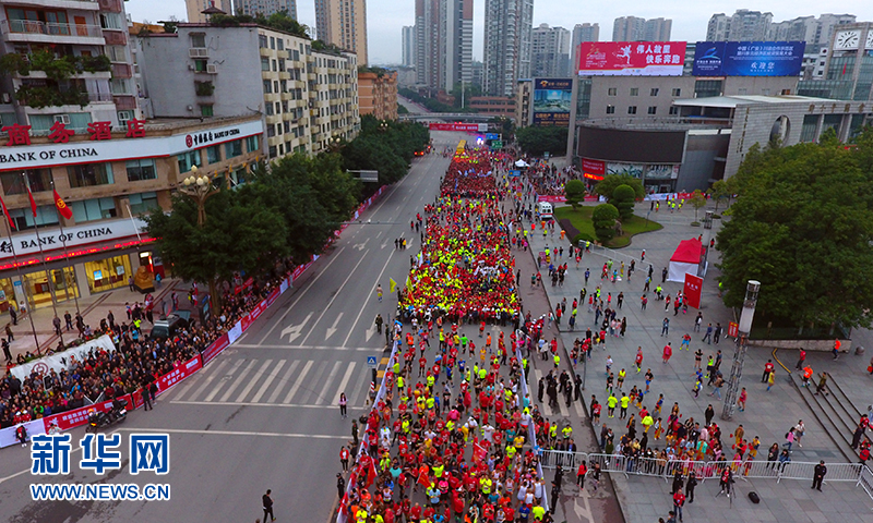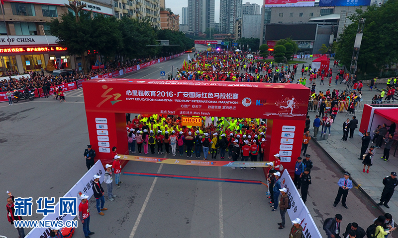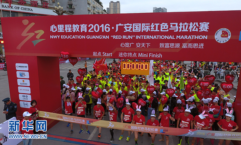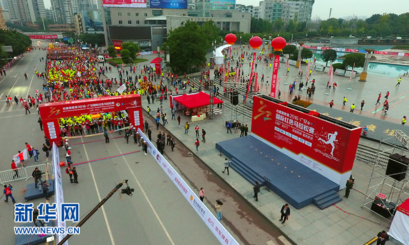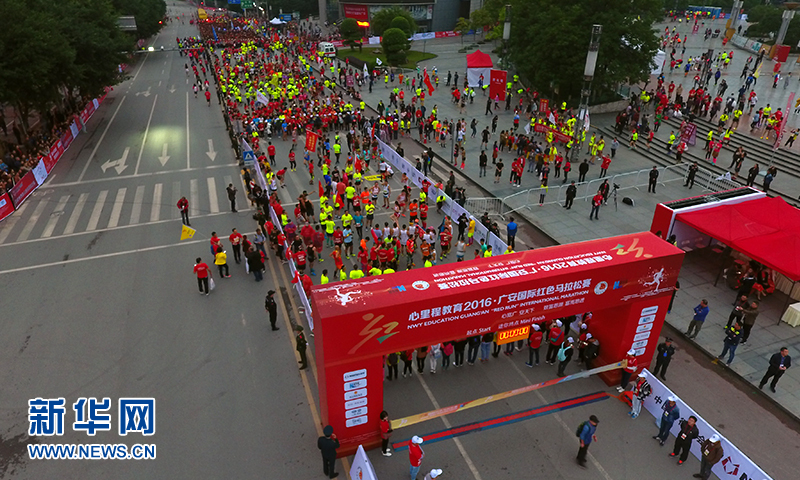 10月16日,心里程教育·2016广安国际红色马拉松赛正式开赛,近万名跑者在