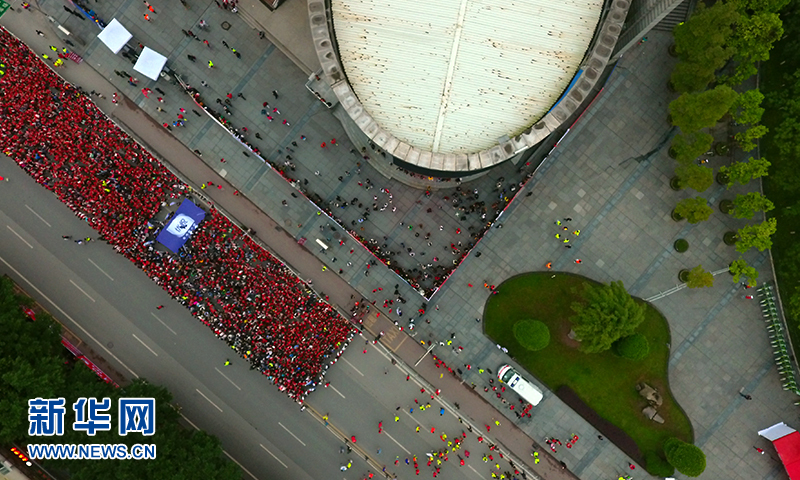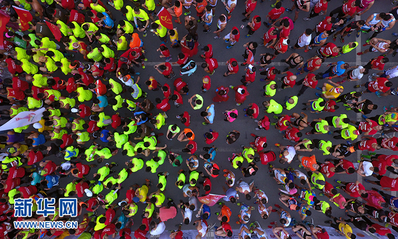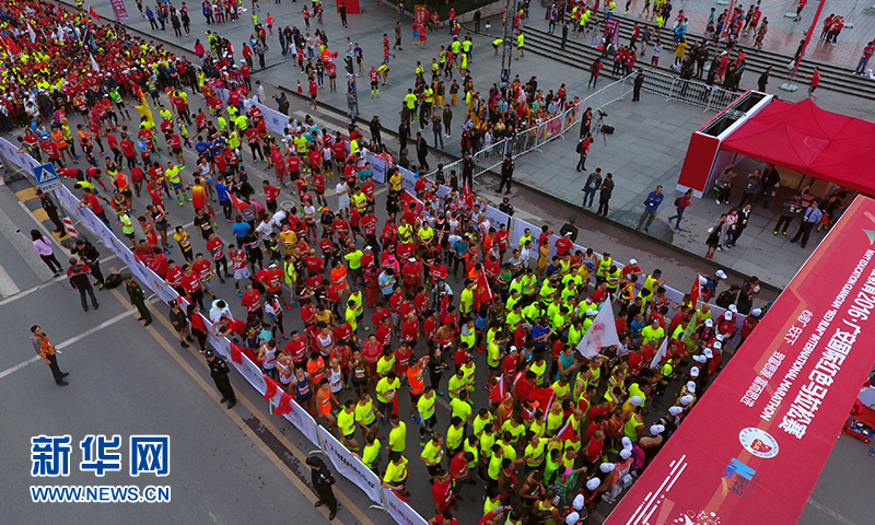 图为无人机航拍参赛选手等待起跑10月16日,心里程教育·2016广安国际红色马拉松赛正式开赛,近万名跑者在四川广安...