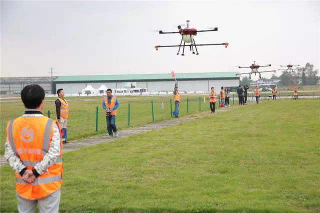 在试飞仪式上,五彩的烟花里,四驾“雨田一号”植保无人机在操作员把控下,整齐地完成了起飞、空中直角转弯、低空喷洒的任务。参与的人们争相拍照,纷纷记录下平时难于一见的场景。