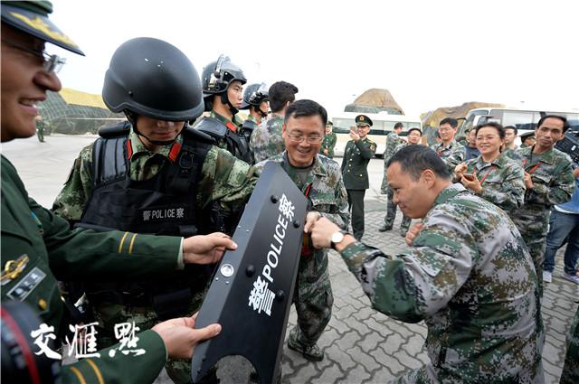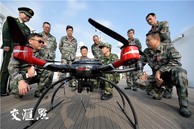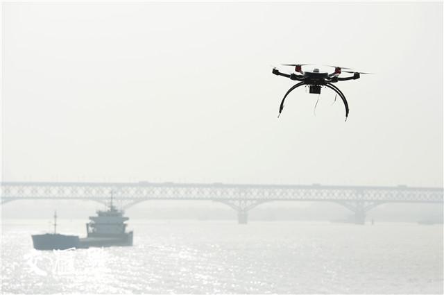 10月17日,全国国防专题研究班一行乘坐海巡0603指挥艇来到江苏边防总队南京港检查站进行实地教学活动,巡航期间船顶甲板“边检空中巡查器”升空巡查,现场展示江苏边防“边检空中巡查器”和执法船实行“空中、江面、岸线”三位一体的管控模式。图为边防战士操控无人机巡航。
