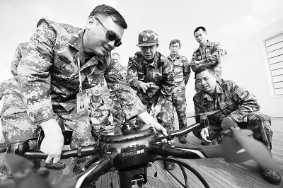 前天,江苏边防总队南京港边防检查站开展技术装备与服务系统展示活动,向参观者介绍该站边检警务科技化建设取得的成果。近年来,南京港边防检查站引进先进的智能装备与信息技术,与边检警务全面对接,建立起科技化、便捷化、人性化的边检服务与执法体系。图为现场展示边防江上巡查无人机装备。