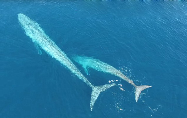 从无人机拍摄的画面来看,这头蓝鲸妈妈长约80英尺(约24.38米),幼鲸约4-6个月大。一般蓝鲸都在深海哺育幼鲸,此次“母子”在海面上同游的现象实属罕见。拍摄该视频的船长称,在海上行走了20年,这也是他第一次看到这样的画面。另一位海洋生物学家看到视频后也称这是一个非常特别的现象:“我们本就很难看到蓝鲸和它们的孩子同时出现。而要看到蓝鲸哺育幼鲸,那真得靠机缘巧合。”