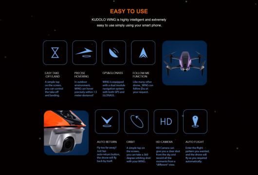 KUDOLO WING是一款航拍无人机,更是一款可以进行空中表演与游戏竞赛的无人机。用户不仅可以用它进行空中抓物、空中声光表演,还可进行飞行表演比赛,或者协同完成团队任务。