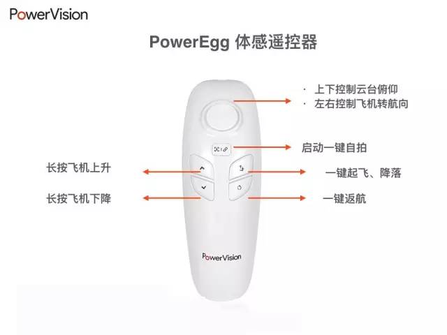 PowerEgg配备了体感遥控器,可以用遥控姿态来控制飞机前后左右飞行,用户可以在遥控器辅助下轻易完成飞行器的各种操作。