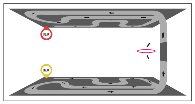 比赛开始攀爬无人机从地面起飞,空中穿越障碍飞行后,从上方天花板位置沙盘赛道攀爬飞行,回到比赛起点,用时最短者获胜,比赛穿插现场观众体验。