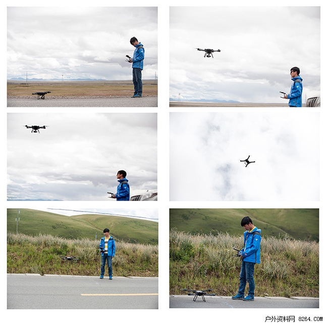 下面这张图从左到右、从上至下记录了飞机的整个飞行过程,无人机从地面上升起,从低头看它到平视再到仰视直到无人机飞向高空,飞机的上升速度还是很快的,完全来自于无人机的强大动能。空中对无人机进行了一些控制操作,请注意这是在高原上进行测试和拍摄的,这台无人机依旧展现了自己卓越的性能。最后的两张图是飞机降落的照片,中间还停了一下,手动拉动拉杆,直到无人机落地机翼不再转动即可。