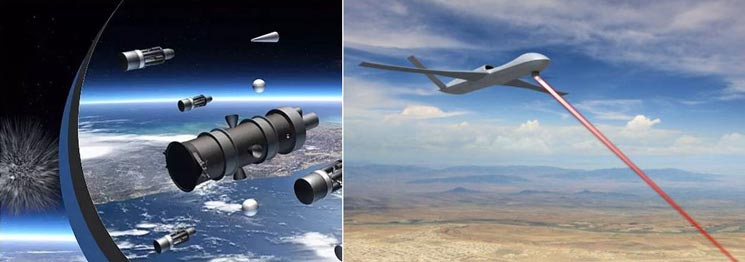 资料图:左图:美国军方近日授出“多目标杀伤器”(MOKV)的相关合同,“多目标杀伤器”可用于拦截一枚来袭导弹释放的多个弹头和诱饵,从而提升导弹防御系统的效率。右图:“无人机激光反导”研究项目。