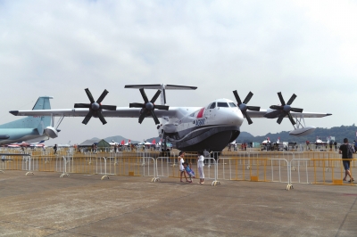 我国自主研制的大型水陆两栖飞机AG600亮相珠海航展静态展示区。