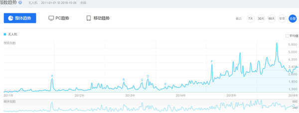 当下,无人机绝对炙手可热。从百度指数上可以看到,自2011年开始到现在,无人机的热度基本处于高速攀升状态。这证明不仅是业内对其非常关注,普罗大众也因为无人机的快速发展而展现出浓厚的兴趣。