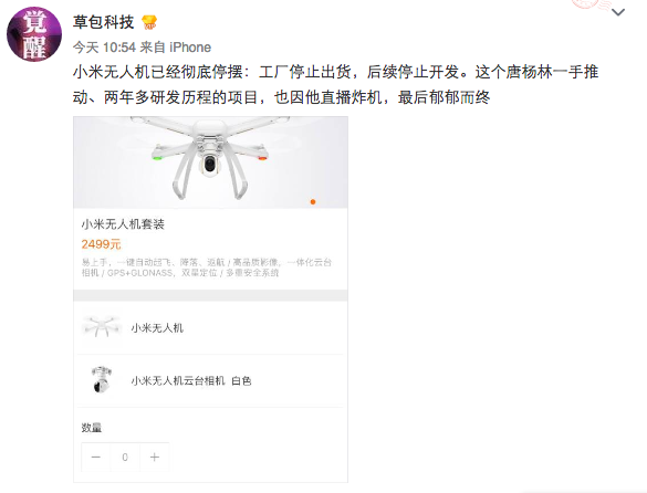 “小米无人机已经彻底停摆:工厂停止出货,后续停止开发。这个唐杨林一手推动、两年多研发历程的项目,也因他直播炸机,最后郁郁而终。”今天中午,微博帐号为“草包科技”爆料称小米无人机已经停产,后续也将停止开发。