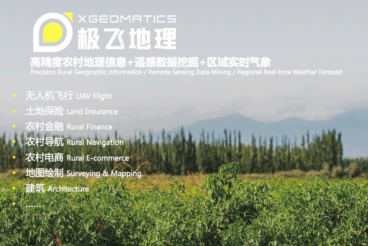 极飞地理提供包括高精度的地理信息、遥感数据挖掘和区域实时气象等多项服务,为无人机飞行、土地保险、农村金融、农村导航、农村电商、地图绘制等领域提供基础服务。