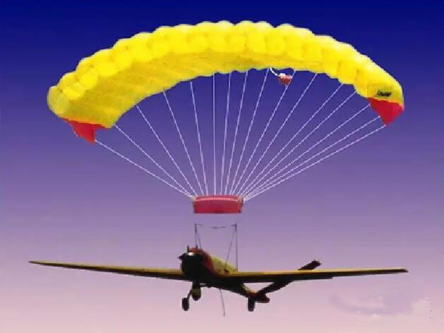 这是一种较普通的回收方式。降落伞由主伞和减速伞(也称阻力伞)二级伞组成。当无人机完成任务后,地面站发遥控指令给无人机,使发动机慢车,飞机减速,降高。到达合适飞行高度和速度时,开减速伞,使飞机急剧减速,降高,此时发动机已停车;当无人机降到某飞行高度和速度时,回收控制系统发出信号,使主伞开伞,先呈收紧充气状态,过了一定时间,主伞完全充气;无人机悬挂在主伞下慢慢着陆,机下触地开关接通,使主伞与无人机脱离。这是对降落伞回收过程最简单的描述,省略了中间环节和过程。为尽量减少无人机回收后的损伤,特别是为保护机载任务设备,有些无人机还在机体触地部位安装减震装置,充气袋是一种常用的减震装置。同时还要考虑到机体着地部位要尽可能远离任务设备舱。