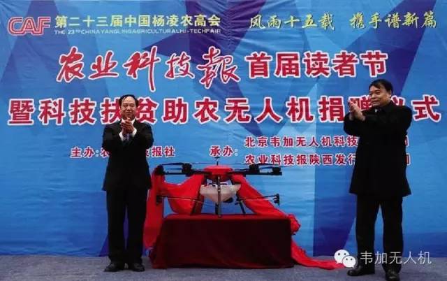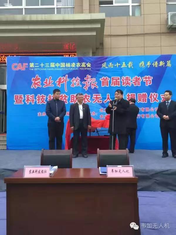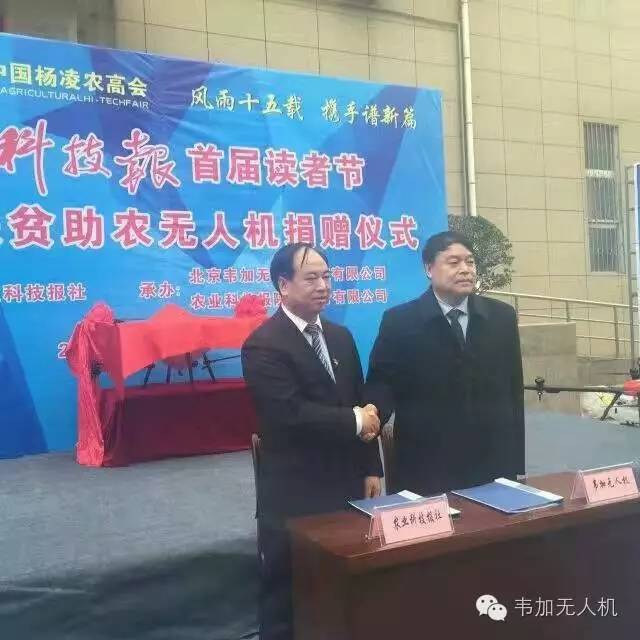 11月6日,在第二十三届中国杨凌农高会上,农业科技报社与北京韦加无人机科技股份有限公司签署《战略合作协议》,公司董事长于保宏出席农业科技报首届读者节暨科技扶贫助农无人机捐赠仪式,韦加股份向报社捐赠一架韦加植保无人机,作为报社科技下乡扶贫工程和植保服务使用。