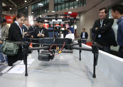 资料图片:11月1日,第18届中国国际工业博览会在上海揭幕。图为观众参观大疆科技展出的“无人机”。