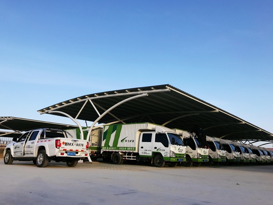 (极飞农业新疆运营中心的服务车辆整齐摆放)