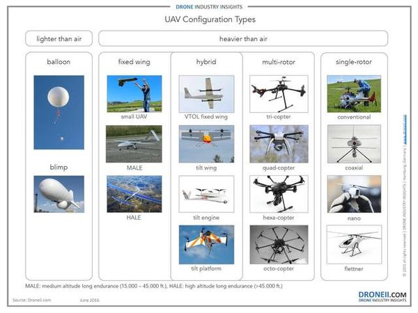 根据上图,我们看到无人机可以分为比空气轻的和比空气重的两类,形态上还包括热气球、飞艇、固定翼、多螺旋桨、单螺旋桨、固定翼结合螺旋桨等多种机型。我们现在最常见的多个螺旋桨配摄像头的无人机只是其中的一部分而已。
