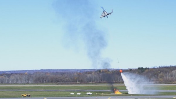 洛克希德·马丁公司使用了一架对飞行员不做硬性要求的卡曼(Kaman) K-MAX直升机和一架能执行灭火任务的Indago四旋翼无人机。 Indago无人机能够找到“着火点”并将位置信息传回给操作员,随后操作员再将位置信息“传给”K-MAX直升机。 K-MAX直升机能够悬停在河面上空,放下吊桶打水,然后再折回火灾现场。