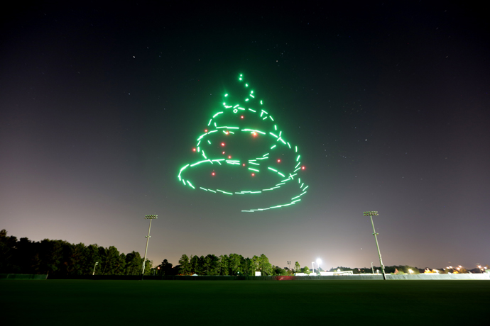 譬如,每架无人机都采用柔性泡沫塑料和无螺丝结构设计,不但重量超轻(仅 280 克),而且组装方便(不超过 15 分钟);此外,内置的 LED 灯还可根据 RGBW (红、绿、蓝、白) 亚像素光谱创造出40亿种颜色组合,完全可以满足各类商演灯光秀的需要。
