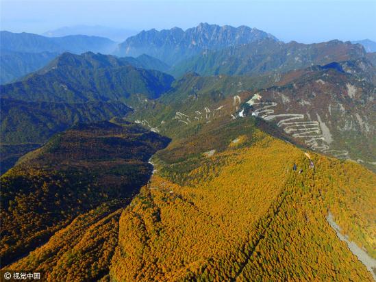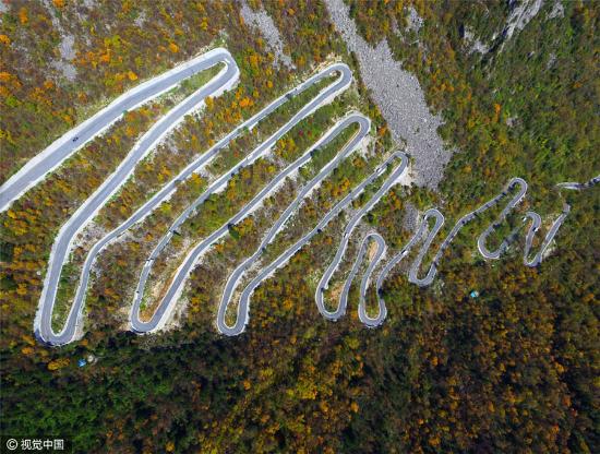 近日,陕西宝鸡,无人机从空中俯瞰连绵群山风景,这里的弯道多且狭窄,急弯频频。地址位于眉县的太白山,是秦岭的主峰,蜿蜒曲直的山路据说有72道拐。在金秋时节,山上红绿相间,景色十分优美。