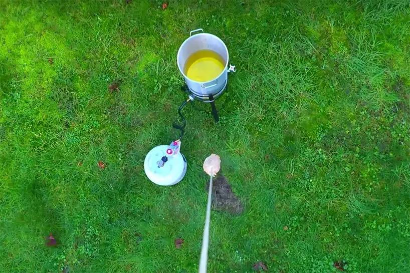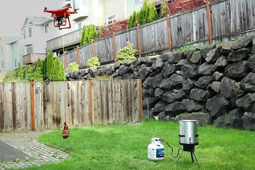 到了油炸火鸡的时候,将一小块火鸡肉包在挂网里,并将绳头拴在了无人机的边缘。通过遥控放入一个巨大的户外油锅里,油炸25分钟后就完全煮熟了。