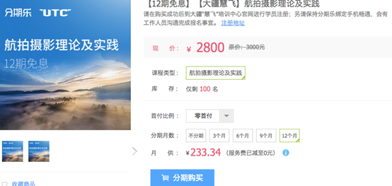 为了让更多年轻航拍爱好者和有志于成为职业飞手的年轻人负担起全方位培训的费用,分期乐携手DJI大疆创新旗下的慧飞无人机应用技术培训中心(Unmanned Aerial Systems Training Center,UTC),为用户提供新飞手入门、行业进阶、设备维护等培训课程的免息分期付款活动,分12个月付款,每月月供低至233元。据了解,慧飞的认证是全球认可的职业认证,可为年轻人开启全新就业机会,在迅猛发展的无人机应用领域先人一步。