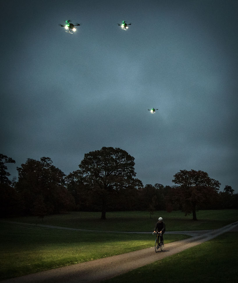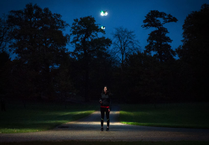 英国Direct Line保险公司与无人机专家合作,推出了一个全新的项目Fleetlights,这个项目利用无人机为有需要的用户提供照明服务,帮助人们减少黑暗路段存在的潜在危险。这个项目也类似于Uber ,用户能够通过应用程序发送照明请求,该公司的无人机就能飞抵用户所在的位置。在没有路灯的路段会给车辆和行人带来不安全因素。所有有了这个项目以后不管是下夜班回家的路上、夜跑或者是夜间骑行,还是在漆黑的乡间小路上散步都有贴心的无人机为您照明。
