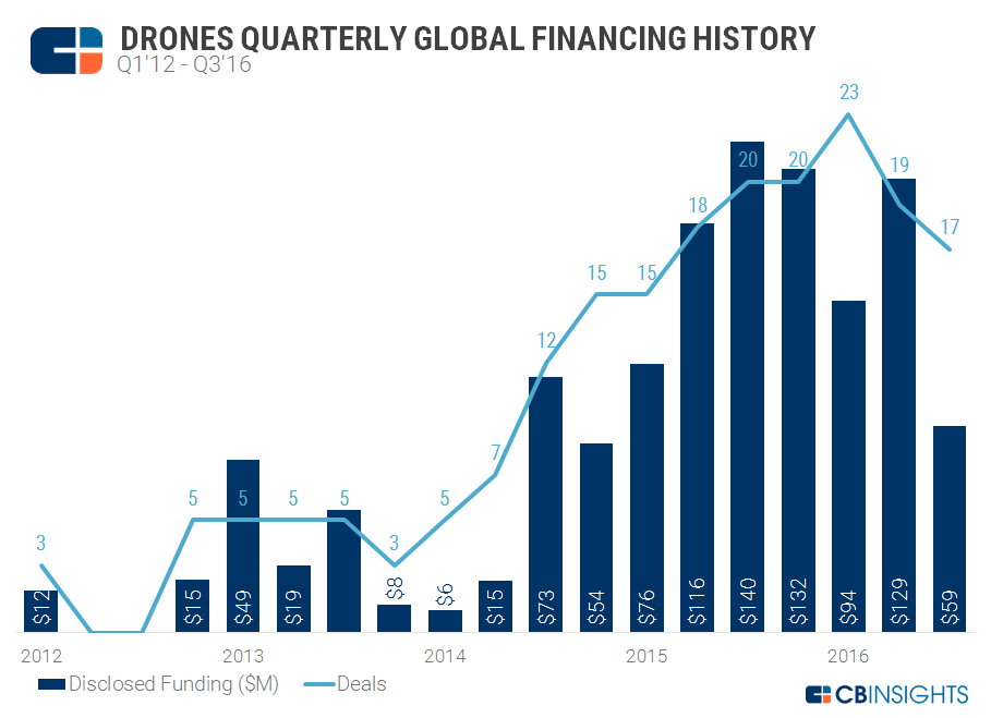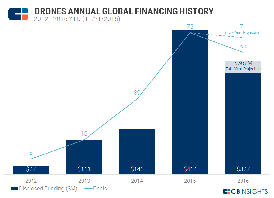 无人机行业已经获得很多投资,2015年该行业投资额增长214%。现在无人机行业已经超越了硬件,该行业的软件和媒体企业也获得了投资者的关注。
