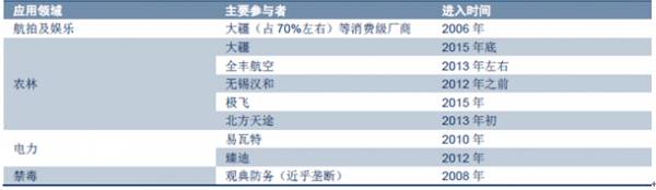 1、应用服务:总体来讲,目前无人机应用服务主要集中在航拍服务方面,竞争门槛较低,无法带来稳定的收入;而从长期来看,警用安防、国土测绘、影视拍摄、农林植保、电力巡检等领域的应用服务拥有巨大市场空间,行业应用经验、飞手和无人机的数量和质量将会成为相关企业的核心竞争力。