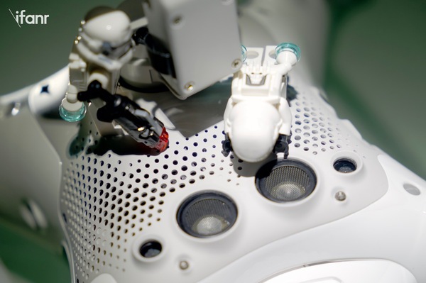 下方的超声波传感器及双目摄像镜头。Phantom 4 的超声波传感器,声纳银色小环包围,但 Phantom 4 Pro 改用了黑色的小环。