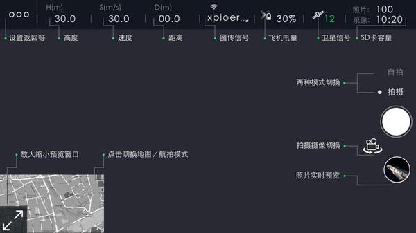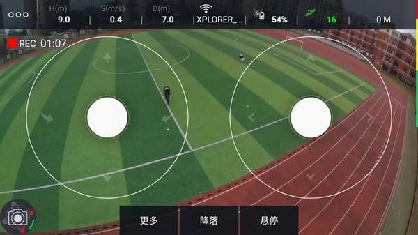 XPLORER Mini舍弃了遥控器的控制,直接用手机控制。通过下载XIRO XPLORE App,选择XPLORER Mini就可以进入操控主界面了。第一次进入我们可以看到一个很详细的界面说明,包括实时提示速度,距离,高度,电量等等。熟悉这些项目对于实际飞行来说是非常重要,所以在练习的时候可以低空飞行一段时间以熟悉每个操作,以避免在飞行过程中手忙脚乱,遇到紧急情况时不知道怎么处理。
