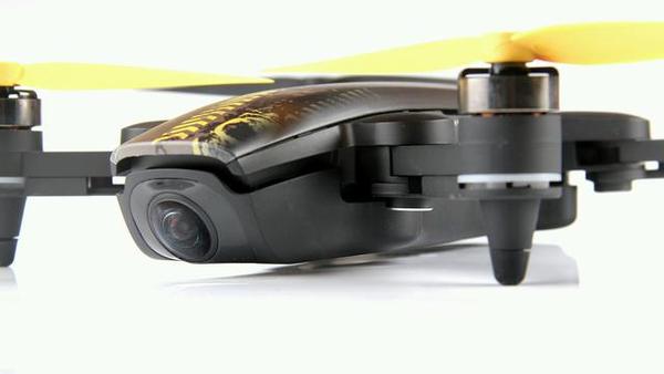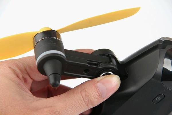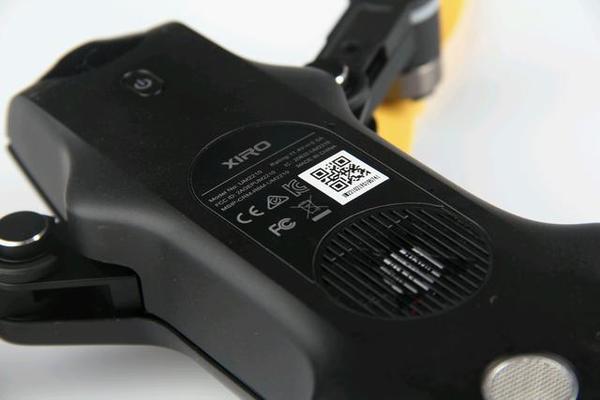 确实,XPLORER Mini整个背部机壳布满迷彩元素,一条黄色箭头标志贯穿其中,动感而又处处充满活力!配上一黄一黑的2对螺旋桨叶!说他是大黄蜂还真不为过。整体机身外壳采用的是工程塑料,略带磨砂手感,对于小型无人机,小意味着在设计上会有更高的集成度,比如机身,机臂等这样部分。XPLORER Mini机身设计比较小,大概重432g左右,轴距为23cm左右。