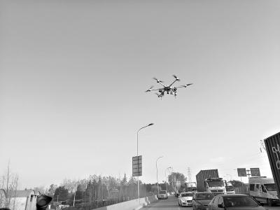 昨日凌晨6时许,一架直径1.6米的6轴旋翼无人机在三环线东西湖段拔地而起,随着无人机的不断上升,三环线长丰桥路段车辆流量、交通状况清晰可见。