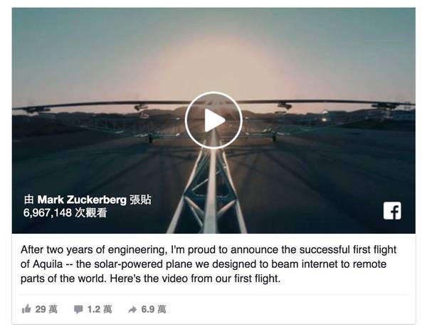 Facebook 历时两年研发用来传输网路讯号的太阳能无人机「Aquila」于 6 月 28 日正式升空试飞成功。稍早 Facebook 创办人兼执行长Mark Zuckerberg公开了首次试飞影片。