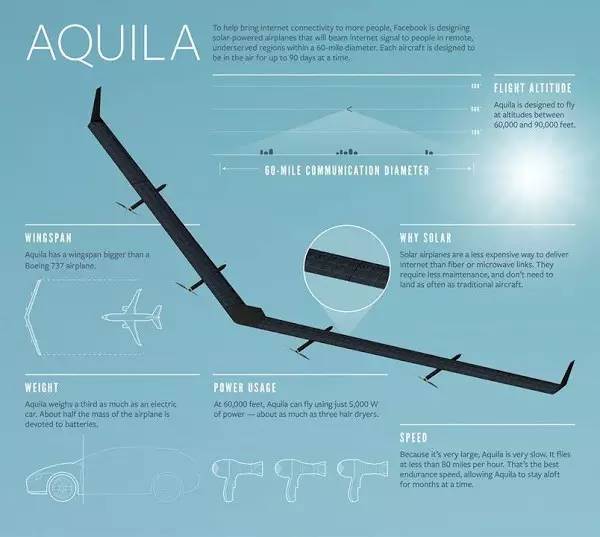 Facebook 的「Aquila」无人机计画,目的是要使居住在偏远地区的人能够连上网。现今全球仍有 40 亿人没有连上网,约占世界人口六成。其中,有 16 亿人居住在偏远地区,以现有网路技术与设施,仍得耗费大量时间与成本,才能让这些地区的人有可负担的网路。